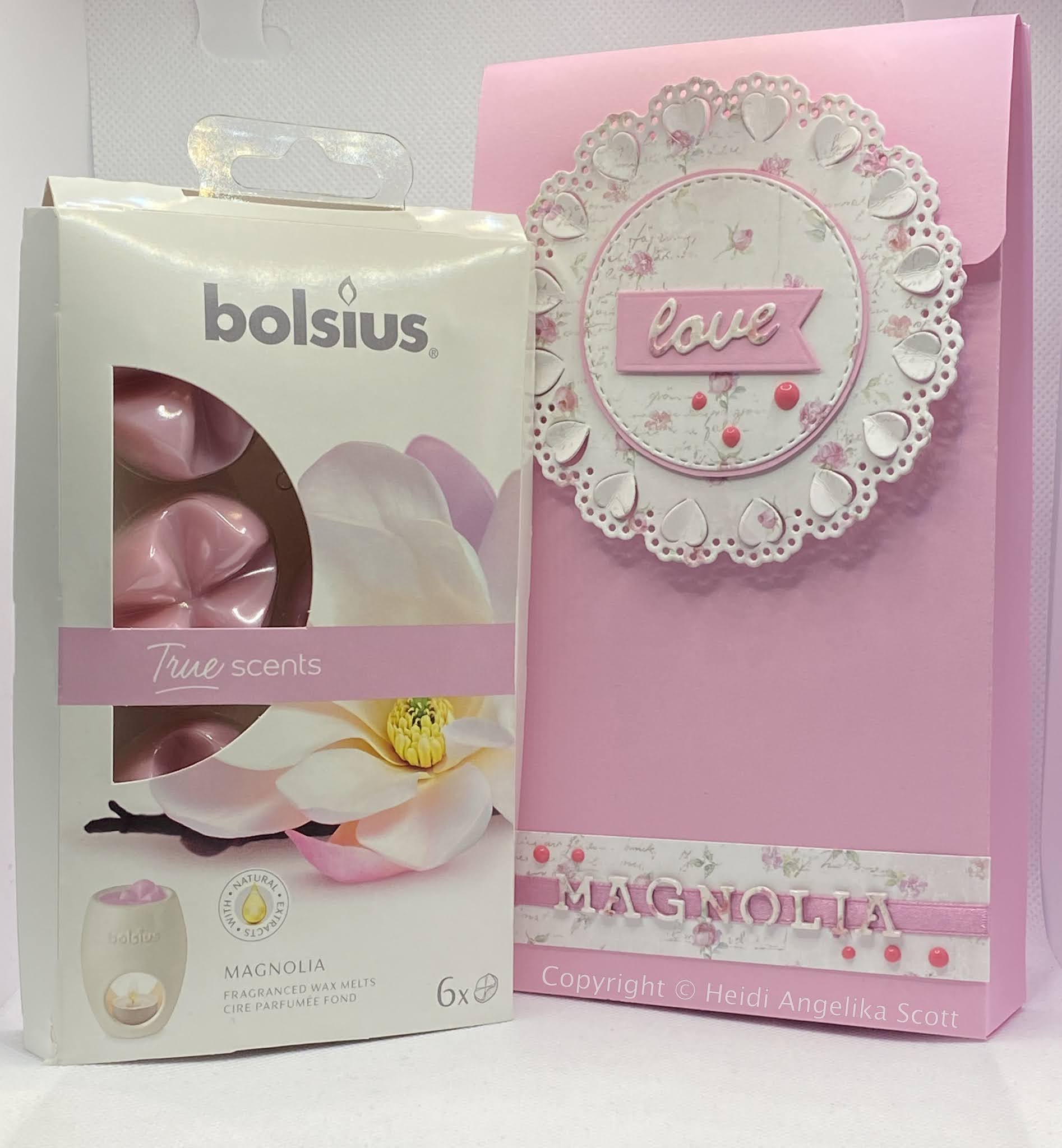 I started out making a box that had the right dimensions, but I wasn't happy with the papers that I had used, so therefore I started over. The result was the pink box below, that holds the Magnolia Wax Melts. The decorations on that box, set the standards of how I was going to decorate the other boxes, and I am quite happy with the way the boxes show the "trademark" style that I have set for the Love Box Series.